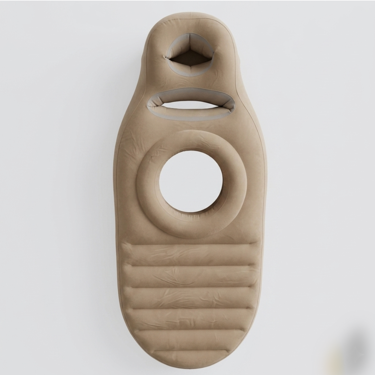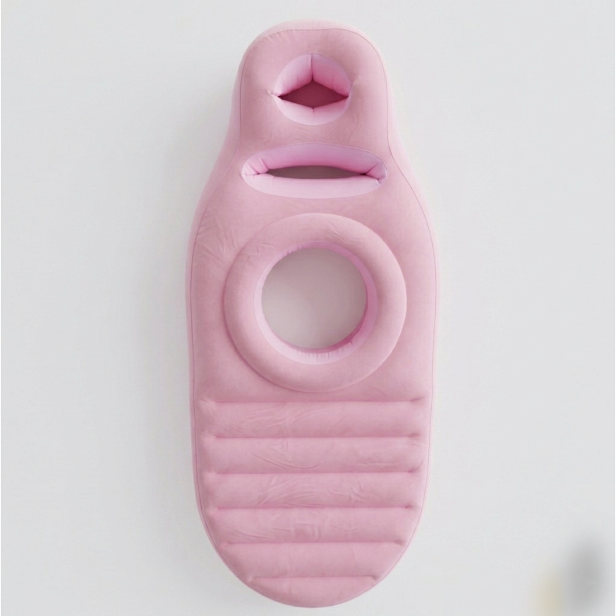 Det ovala hålet är generöst utformat för att passa de flesta kroppstyper och magar, hela vägen fram till förlossningen. Eftersom kudden är uppblåsbar kan du dessutom justera fastheten för att hitta det perfekta stödet för just din form.